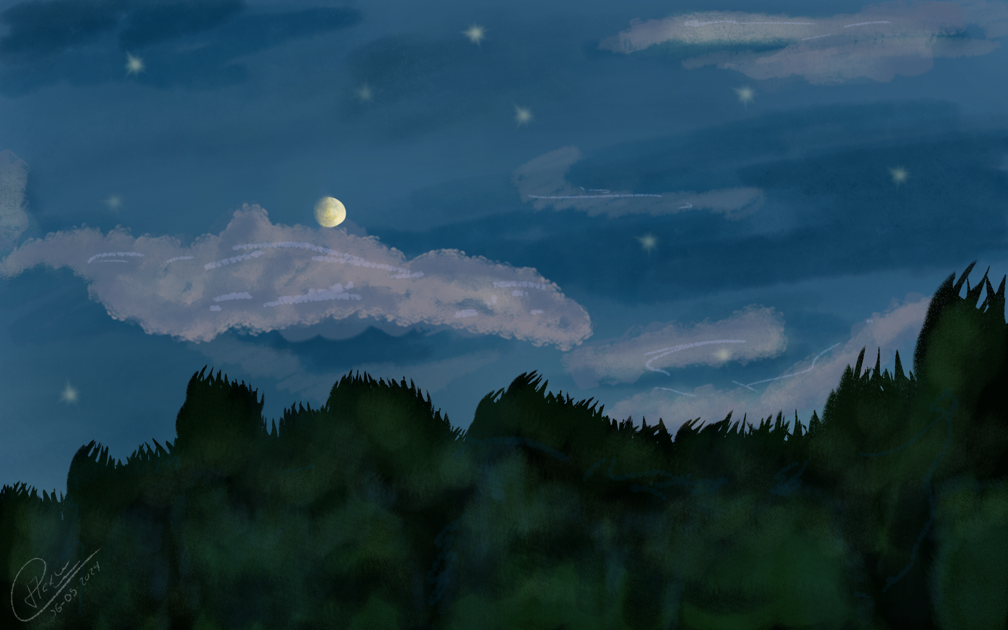 Desarrollo Visual • May 2025 Paisajito nocturno Aquí una pintura digital con la que aprendí a utilizar los pinceles. Con todo y su conejo en la luna.
